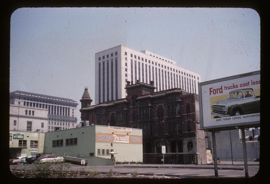 The Amestoy building, 202 North Main Street, occupied half a block on Market Street between Main and Los Angeles Streets. The vacant structure is prepped for wrecking.