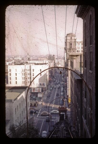 This collection consists of 35mm Kodachrome slides taken between 1954 and 1972. This collection of photographs taken by amateur photographer Palmer Conner documents by street the physical and social changes of Bunker Hill during the earliest stages of redevelopment. The collection is particularly strong in its depiction of the Bunker Hill neighborhood of downtown Los Angeles during redevelopment in the 1950s. Images chiefly consist of views of commercial and residential building exteriors taken from the street, including images of both new construction and older buildings in the process of being demolished.