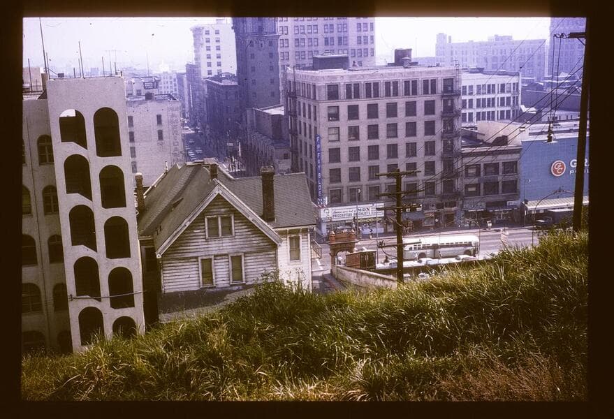 This collection consists of 35mm Kodachrome slides taken between 1954 and 1972. This collection of photographs taken by amateur photographer Palmer Conner documents by street the physical and social changes of Bunker Hill during the earliest stages of redevelopment. The collection is particularly strong in its depiction of the Bunker Hill neighborhood of downtown Los Angeles during redevelopment in the 1950s. Images chiefly consist of views of commercial and residential building exteriors taken from the street, including images of both new construction and older buildings in the process of being demolished.