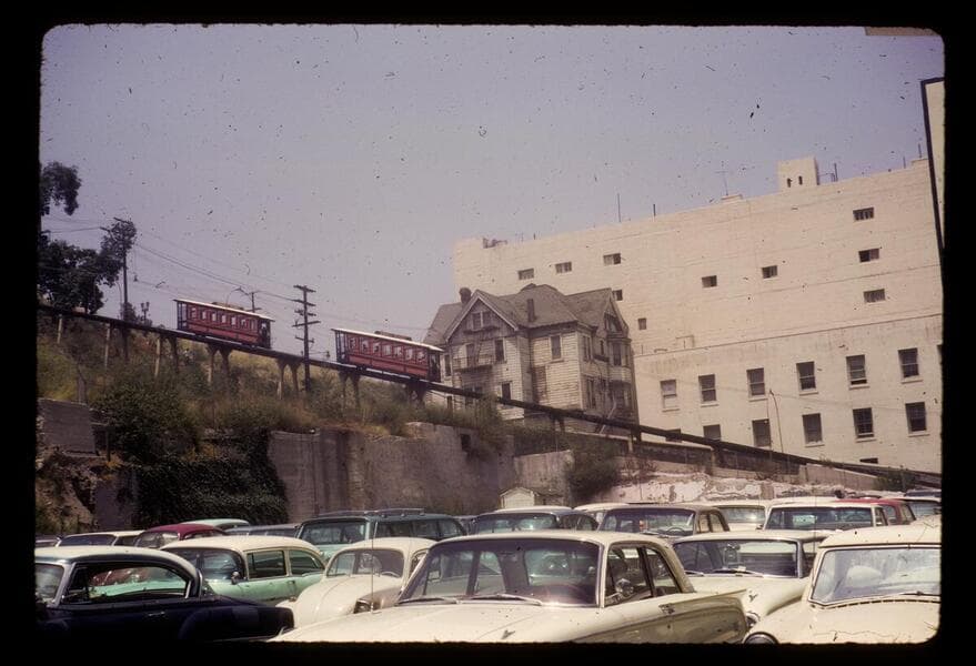 This collection consists of 35mm Kodachrome slides taken between 1954 and 1972. This collection of photographs taken by amateur photographer Palmer Conner documents by street the physical and social changes of Bunker Hill during the earliest stages of redevelopment. The collection is particularly strong in its depiction of the Bunker Hill neighborhood of downtown Los Angeles during redevelopment in the 1950s. Images chiefly consist of views of commercial and residential building exteriors taken from the street, including images of both new construction and older buildings in the process of being demolished.