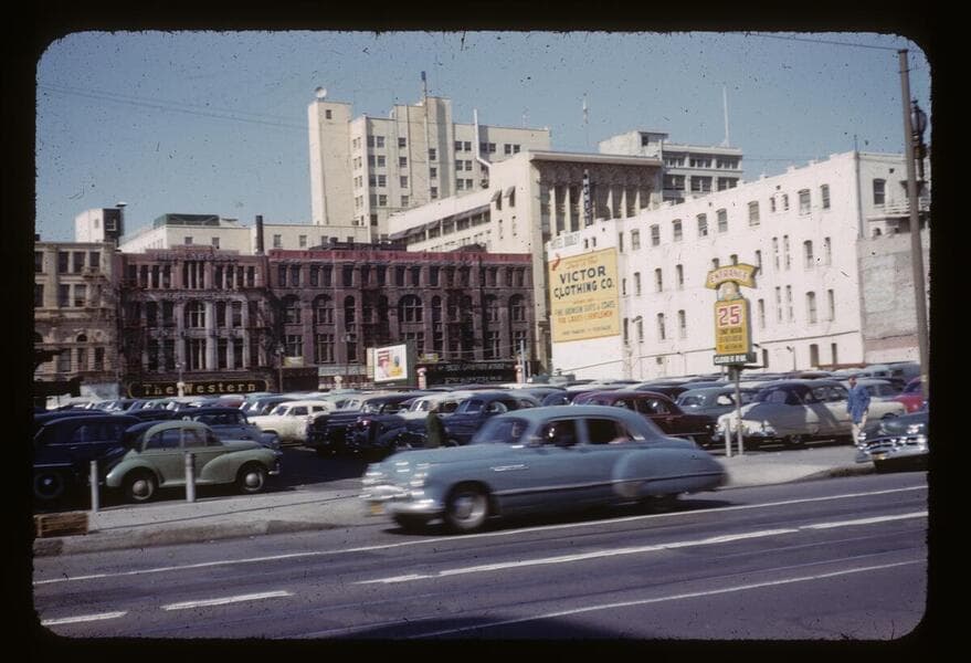 This collection consists of 35mm Kodachrome slides taken between 1954 and 1972. This collection of photographs taken by amateur photographer Palmer Conner documents by street the physical and social changes of Bunker Hill during the earliest stages of redevelopment. The collection is particularly strong in its depiction of the Bunker Hill neighborhood of downtown Los Angeles during redevelopment in the 1950s. Images chiefly consist of views of commercial and residential building exteriors taken from the street, including images of both new construction and older buildings in the process of being demolished.