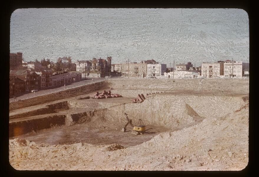 This collection consists of 35mm Kodachrome slides taken between 1954 and 1972. This collection of photographs taken by amateur photographer Palmer Conner documents by street the physical and social changes of Bunker Hill during the earliest stages of redevelopment. The collection is particularly strong in its depiction of the Bunker Hill neighborhood of downtown Los Angeles during redevelopment in the 1950s. Images chiefly consist of views of commercial and residential building exteriors taken from the street, including images of both new construction and older buildings in the process of being demolished.