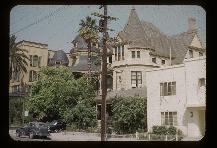 This collection consists of 35mm Kodachrome slides taken between 1954 and 1972. This collection of photographs taken by amateur photographer Palmer Conner documents by street the physical and social changes of Bunker Hill during the earliest stages of redevelopment. The collection is particularly strong in its depiction of the Bunker Hill neighborhood of downtown Los Angeles during redevelopment in the 1950s. Images chiefly consist of views of commercial and residential building exteriors taken from the street, including images of both new construction and older buildings in the process of being demolished.