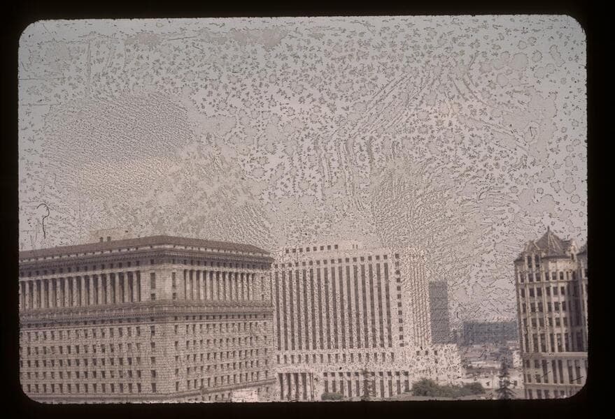 This collection consists of 35mm Kodachrome slides taken between 1954 and 1972. This collection of photographs taken by amateur photographer Palmer Conner documents by street the physical and social changes of Bunker Hill during the earliest stages of redevelopment. The collection is particularly strong in its depiction of the Bunker Hill neighborhood of downtown Los Angeles during redevelopment in the 1950s. Images chiefly consist of views of commercial and residential building exteriors taken from the street, including images of both new construction and older buildings in the process of being demolished.