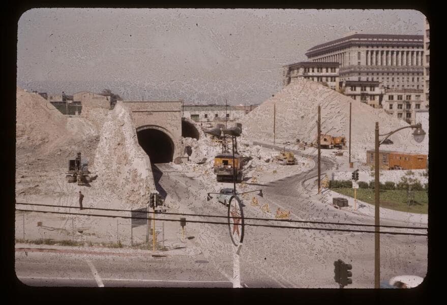 Retaining wall and stairs on left side of Hill Street Tunnels lead up to a vacant Bunker Hill. Circular "NO PARKING" sign hangs between the tunnels. 1952 Los Angeles Police Department Ford Mainline V8 Fordor and unmarked sedan parked nearby.