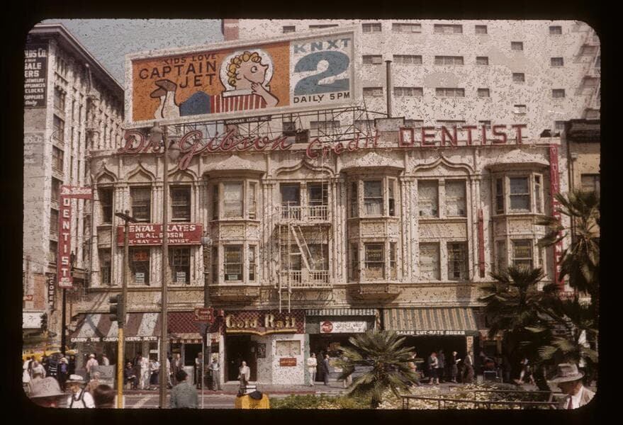 Croyden Apartments Hotel, 620 Sunset Boulevard, at the intersection of Hill Street. Side of building has separate ads for a funeral home and chocolate along with a Morton Salt billboard. Faded Mount Lowe sign on wall to the left. Background building is the Los Angeles Unified School District headquarters at 450 North Grand Avenue.