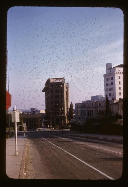 This collection consists of 35mm Kodachrome slides taken between 1954 and 1972. This collection of photographs taken by amateur photographer Palmer Conner documents by street the physical and social changes of Bunker Hill during the earliest stages of redevelopment. The collection is particularly strong in its depiction of the Bunker Hill neighborhood of downtown Los Angeles during redevelopment in the 1950s. Images chiefly consist of views of commercial and residential building exteriors taken from the street, including images of both new construction and older buildings in the process of being demolished.