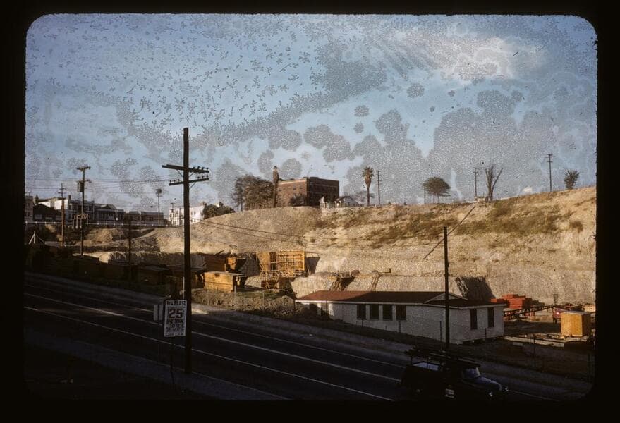 This collection consists of 35mm Kodachrome slides taken between 1954 and 1972. This collection of photographs taken by amateur photographer Palmer Conner documents by street the physical and social changes of Bunker Hill during the earliest stages of redevelopment. The collection is particularly strong in its depiction of the Bunker Hill neighborhood of downtown Los Angeles during redevelopment in the 1950s. Images chiefly consist of views of commercial and residential building exteriors taken from the street, including images of both new construction and older buildings in the process of being demolished.