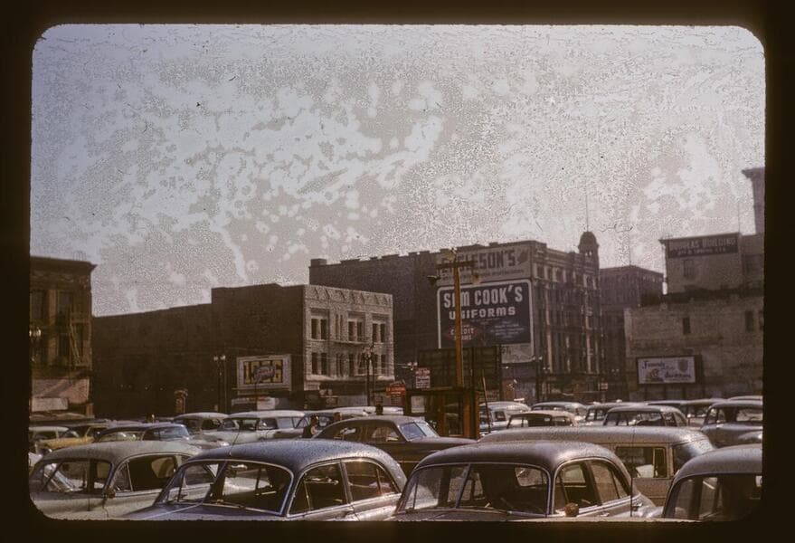 National Title Building, 126 West 3rd Street, on the right and Stimson Building, 129 West 3rd Street, in the middle. City Hall in the left background.