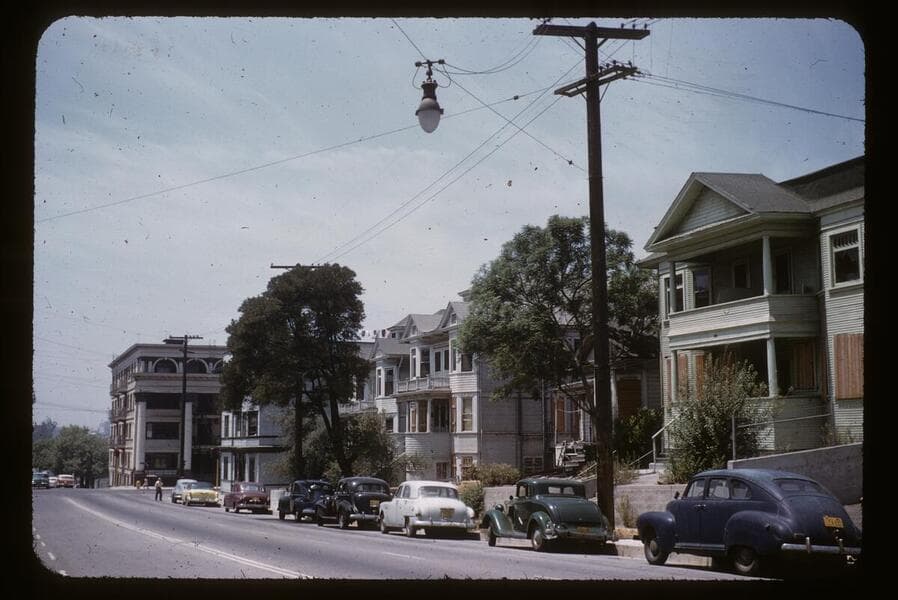 This collection consists of 35mm Kodachrome slides taken between 1954 and 1972. This collection of photographs taken by amateur photographer Palmer Conner documents by street the physical and social changes of Bunker Hill during the earliest stages of redevelopment. The collection is particularly strong in its depiction of the Bunker Hill neighborhood of downtown Los Angeles during redevelopment in the 1950s. Images chiefly consist of views of commercial and residential building exteriors taken from the street, including images of both new construction and older buildings in the process of being demolished.