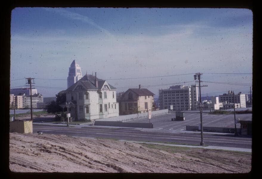 This collection consists of 35mm Kodachrome slides taken between 1954 and 1972. This collection of photographs taken by amateur photographer Palmer Conner documents by street the physical and social changes of Bunker Hill during the earliest stages of redevelopment. The collection is particularly strong in its depiction of the Bunker Hill neighborhood of downtown Los Angeles during redevelopment in the 1950s. Images chiefly consist of views of commercial and residential building exteriors taken from the street, including images of both new construction and older buildings in the process of being demolished.