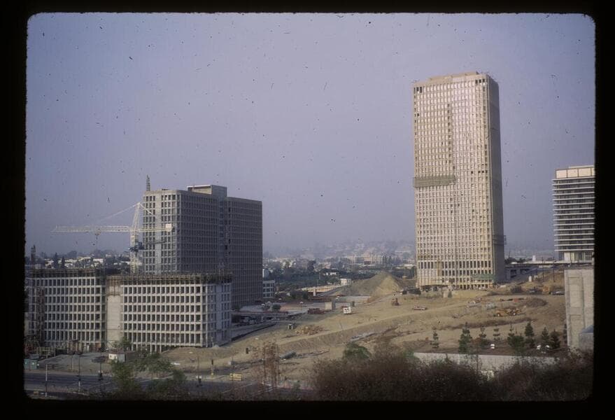 Bunker Hill Towers apartment complex under constrction. Central Tower is at 800 West 1st Street and 32 stories high. Background buildings right of center being built are 19-story companion towers, 234 South Figueroa Street, along Figueroa and Third Streets.