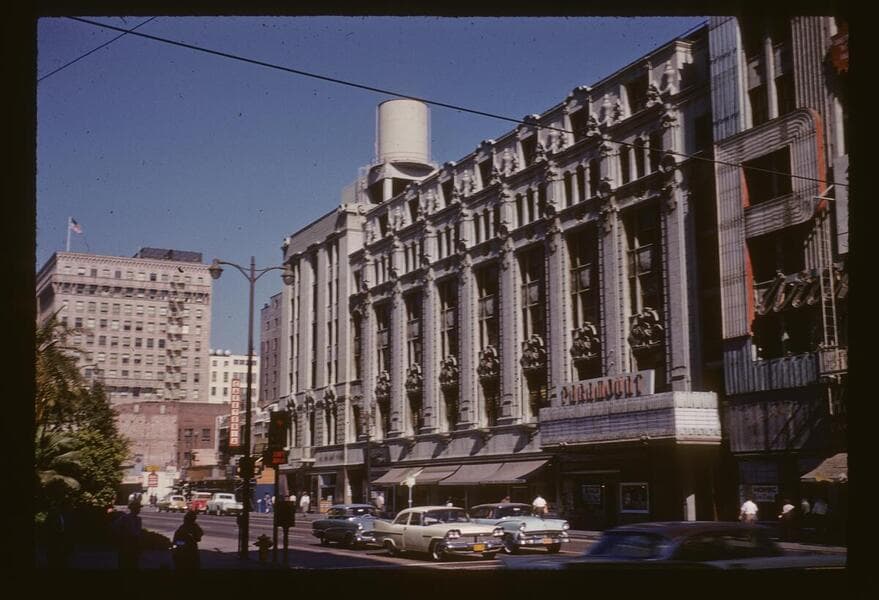 This collection consists of 35mm Kodachrome slides taken between 1954 and 1972. This collection of photographs taken by amateur photographer Palmer Conner documents by street the physical and social changes of Bunker Hill during the earliest stages of redevelopment. The collection is particularly strong in its depiction of the Bunker Hill neighborhood of downtown Los Angeles during redevelopment in the 1950s. Images chiefly consist of views of commercial and residential building exteriors taken from the street, including images of both new construction and older buildings in the process of being demolished.