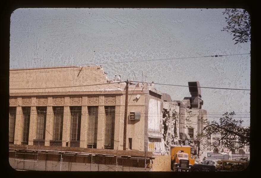 This collection consists of 35mm Kodachrome slides taken between 1954 and 1972. This collection of photographs taken by amateur photographer Palmer Conner documents by street the physical and social changes of Bunker Hill during the earliest stages of redevelopment. The collection is particularly strong in its depiction of the Bunker Hill neighborhood of downtown Los Angeles during redevelopment in the 1950s. Images chiefly consist of views of commercial and residential building exteriors taken from the street, including images of both new construction and older buildings in the process of being demolished.