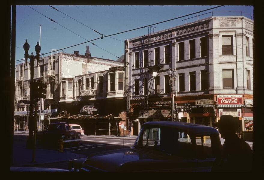 This collection consists of 35mm Kodachrome slides taken between 1954 and 1972. This collection of photographs taken by amateur photographer Palmer Conner documents by street the physical and social changes of Bunker Hill during the earliest stages of redevelopment. The collection is particularly strong in its depiction of the Bunker Hill neighborhood of downtown Los Angeles during redevelopment in the 1950s. Images chiefly consist of views of commercial and residential building exteriors taken from the street, including images of both new construction and older buildings in the process of being demolished.