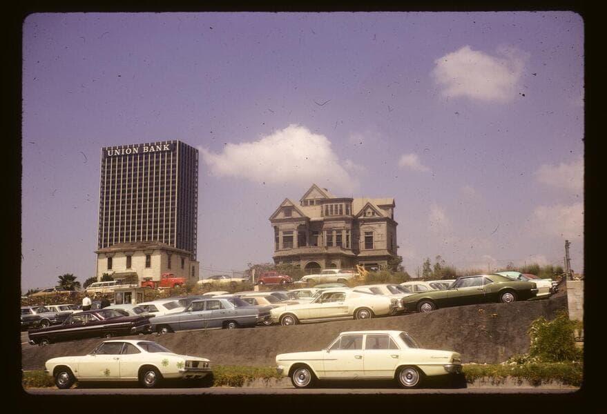 Rear and side view of the YMCA building at 715 South Hope Street. Crocker Citizens Bank skyscraper in the left background.