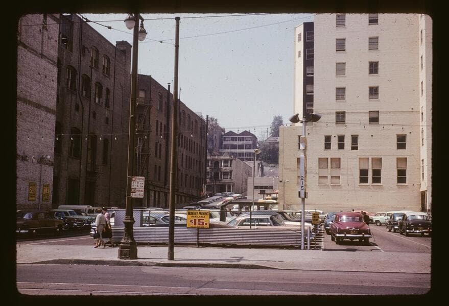 This collection consists of 35mm Kodachrome slides taken between 1954 and 1972. This collection of photographs taken by amateur photographer Palmer Conner documents by street the physical and social changes of Bunker Hill during the earliest stages of redevelopment. The collection is particularly strong in its depiction of the Bunker Hill neighborhood of downtown Los Angeles during redevelopment in the 1950s. Images chiefly consist of views of commercial and residential building exteriors taken from the street, including images of both new construction and older buildings in the process of being demolished.