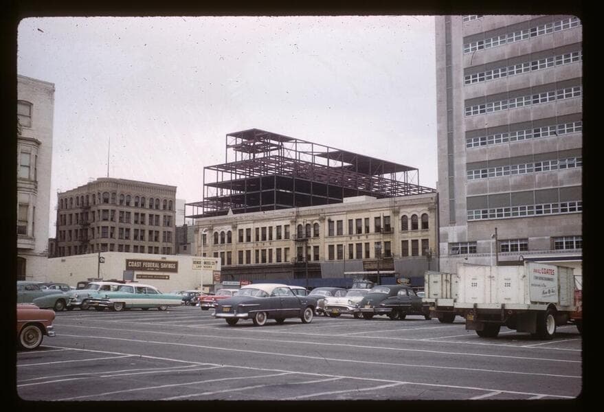 Entire square block, encompassed between 1st Street, 2nd Street, Hill Street and Broadway, being leveled. Fashion League Building (formerly Union League Building), on the corner of 2nd and Hill Streets at right, in the early stages of demolition. 1950 Studebaker Commander parked in the red zone.