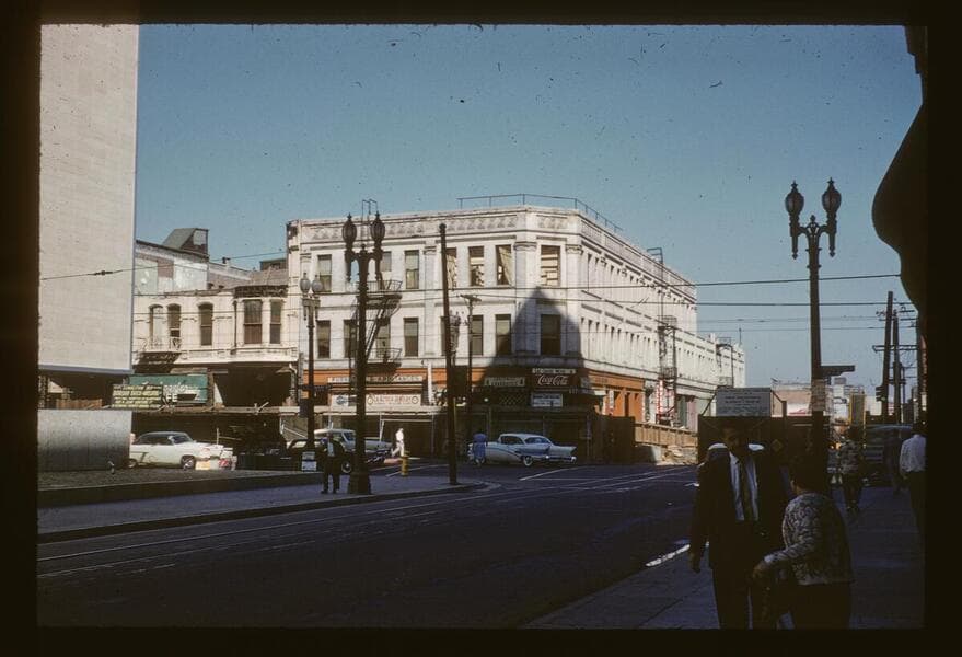 Hellman Building, 223 West 2nd Street, to be demolished by the Cleveland Wrecking Company. Los Angeles Times-Mirror next door and new State Highway Building under construction further down the street.
