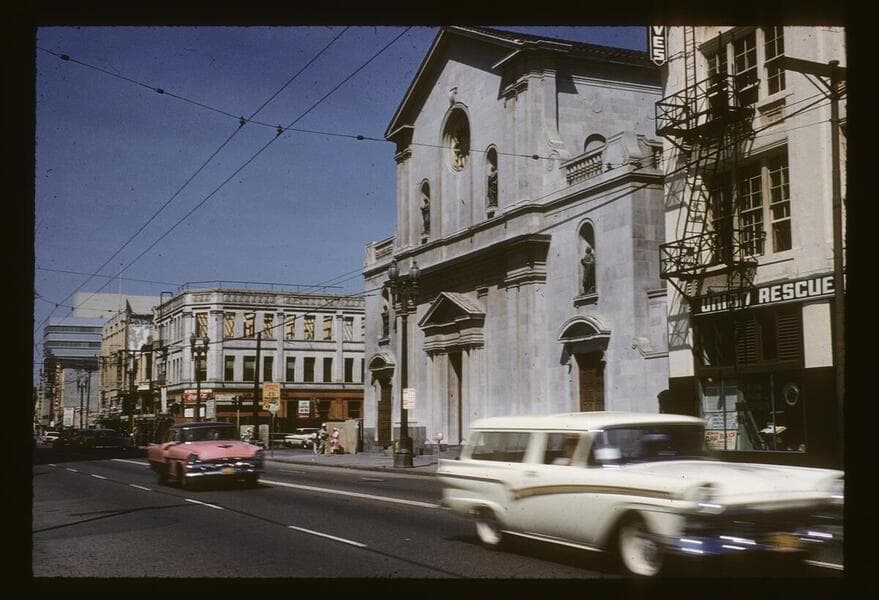 This collection consists of 35mm Kodachrome slides taken between 1954 and 1972. This collection of photographs taken by amateur photographer Palmer Conner documents by street the physical and social changes of Bunker Hill during the earliest stages of redevelopment. The collection is particularly strong in its depiction of the Bunker Hill neighborhood of downtown Los Angeles during redevelopment in the 1950s. Images chiefly consist of views of commercial and residential building exteriors taken from the street, including images of both new construction and older buildings in the process of being demolished.