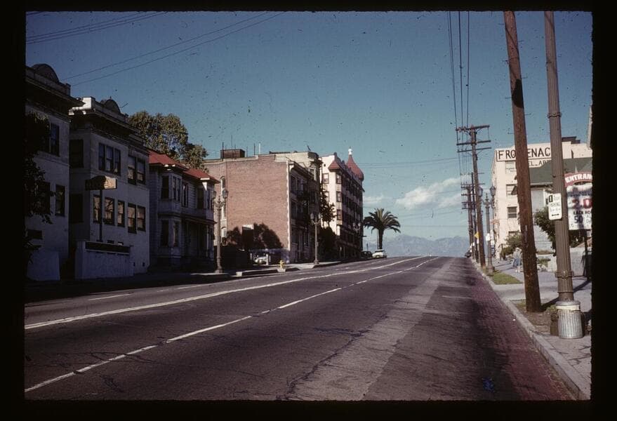 Apartment buildings on the west side of South Grand Avenue. Short palm tree at the corner next to the Dome (formerly the Minnewaska).