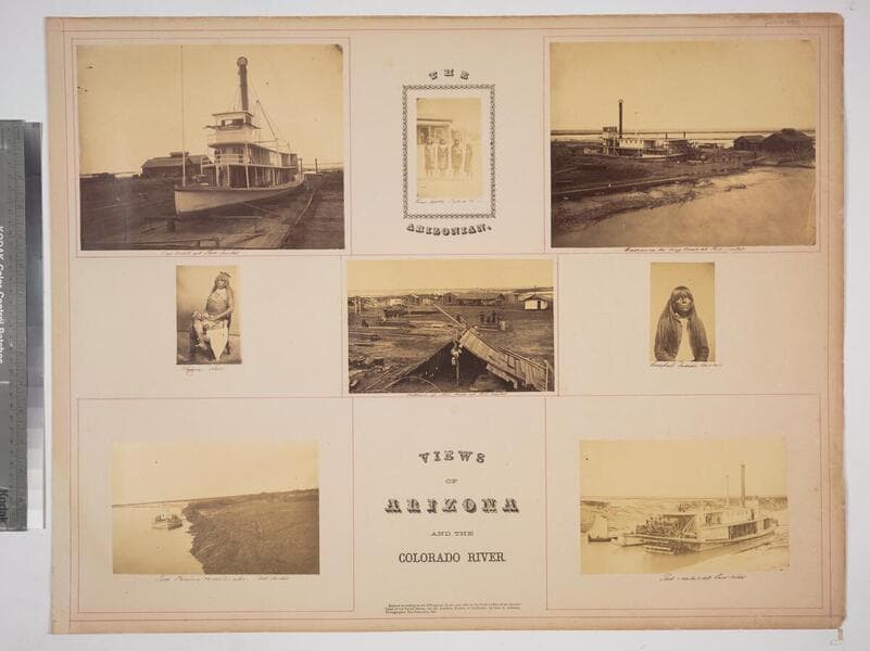 This collection contains 24 albumen photographs by Charles Granville Johnson of Arizona river steamboats and shipyards on the Colorado River and Native Americans, pasted on three boards, each titled "The Arizonian, : Views of Arizona and the Colorado River." The photographs are arranged 8 to a board and primarily juxtapose 4.5 x 7 inch views of river steamboats and shipyards with 2.5 x 3.5 inch portraits of Native Americans of various Arizona tribes in traditional dress. Each photograph has its own handwritten caption within a printed frame; the title and image frames are lithographed.