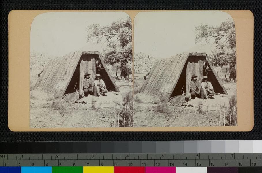 Two Hualapai Indians in front of a wooden shelter