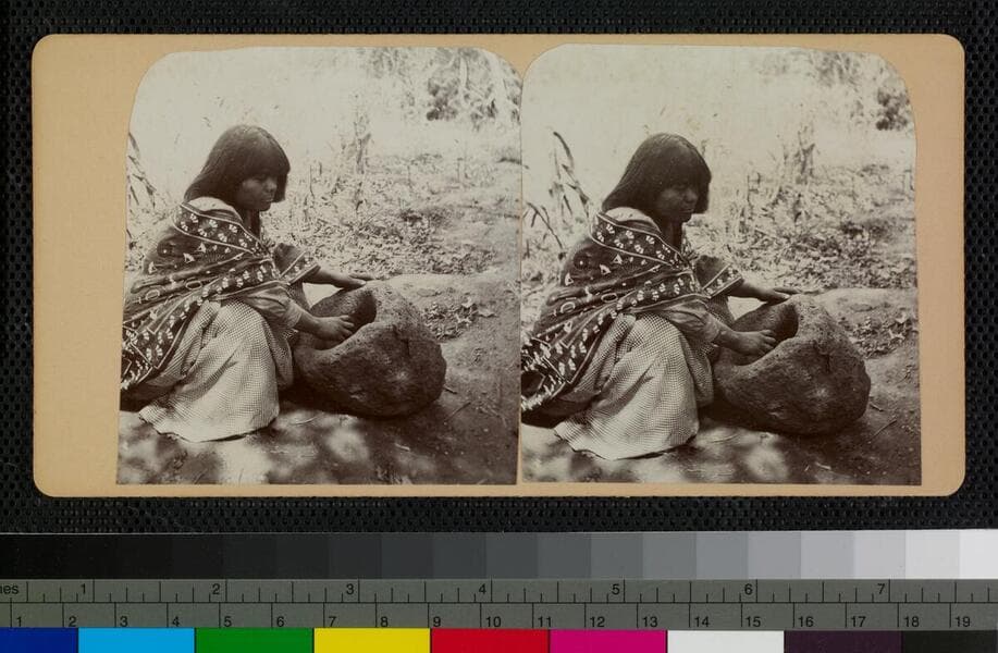 A Hualapai Indian woman using a stone pestle and mortar (or metate)