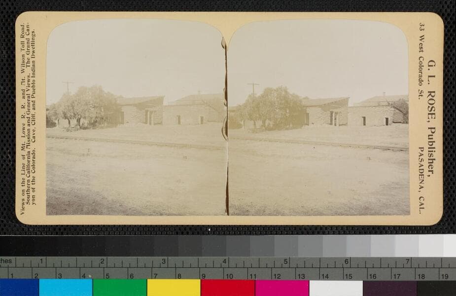 This small, personal album of amateur photographs documents a trip through Southern California, ca. 1880s, from San Juan Capistrano through San Diego County. Of note are views of Indian schools and dwellings in the San Diego area. All of the photographs are accompanied by ink manuscript captions. Subjects are: Mission San Juan Capistrano; two views of people with horse and buggy on the shore near Oceanside; caves at La Jolla; adobe building at Old Town [San Diego, possibly Casa de Estudillo]; Indian schools in Old Mission Valley; people camping among the old olive trees on the Old Mission ranch; Sweetwater Dam; mud and brush huts at Agua Caliente; camping by the roadside before reaching Strawberry Valley [San Diego County]. The album has paper covers, tied with a ribbon binding. The cover has a hand-painted title: Views of Southern California. The compiler and photographer are unknown.