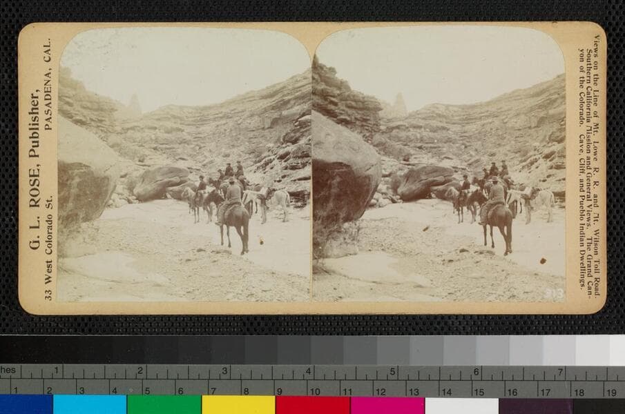View of people on horseback and in a wagon, seen at a distance, riding through canyon.