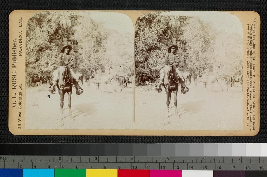 George Wharton James is seated in foreground, and an Indian man stands at the cave behind him.