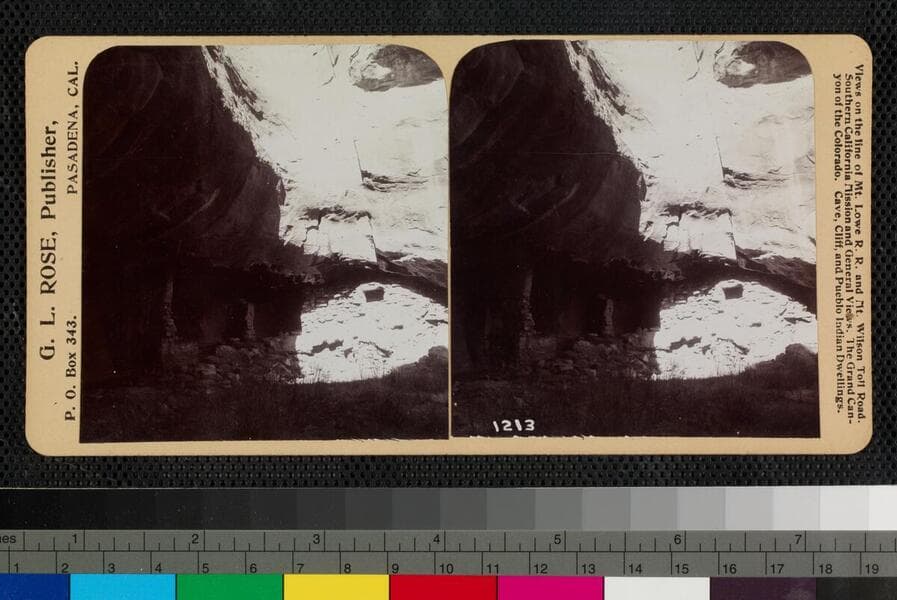 A shelter(?) and fence made of wood and sticks is in the background, at left. There is a wagon beneath the rocks, at center.