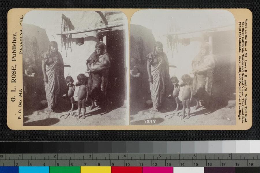 A Hopi woman holds a child in front of a ladder at an unidentified pueblo