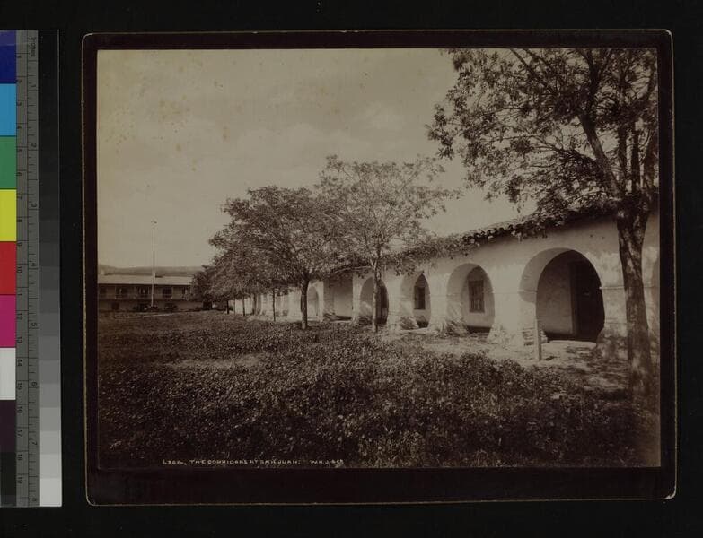 A collection of albumen photographs of 12 California Missions, taken by nineteenth-century photographer William Henry Jackson sometime between 1885 and 1890. All of the photographs are titled and signed, "W.H.J. & Co." One or more images of the following missions are included: San Antonio de Padua, San Carlos Borroméo de Carmel, San Diego de Alcalá, San Fernando Rey, San Francisco de Asís, San Gabriel Arcángel, San Juan Bautista, San Juan Capistrano, San Luis Rey, San Miguel Arcángel, Santa Barbara and Santa Ines. The photographs primarily show the missions' front façades or courtyards, both in ruins and with slight repair work.