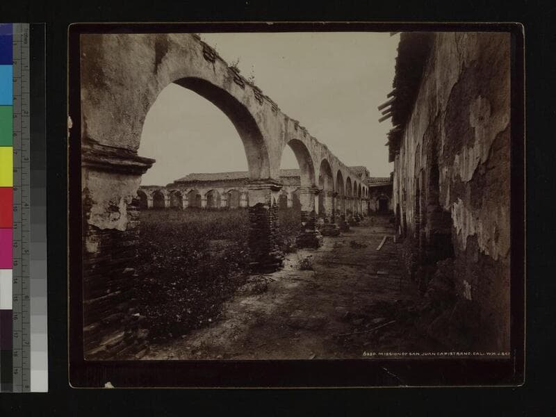 View of mission and cloister ruins. A man with a cart can be seen under the tree at center.