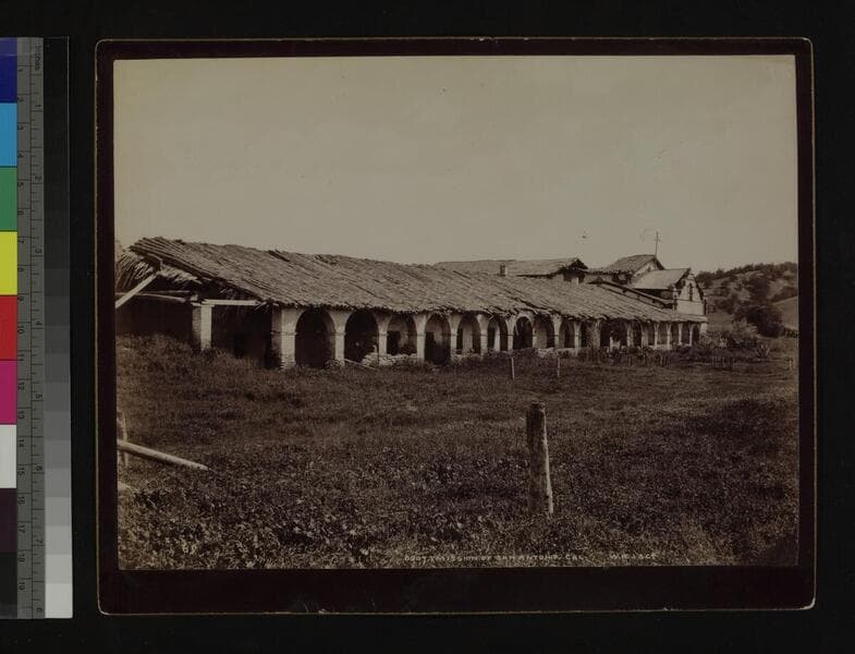 View of corridor of mission, where a buggy or horse carriage can be seen.