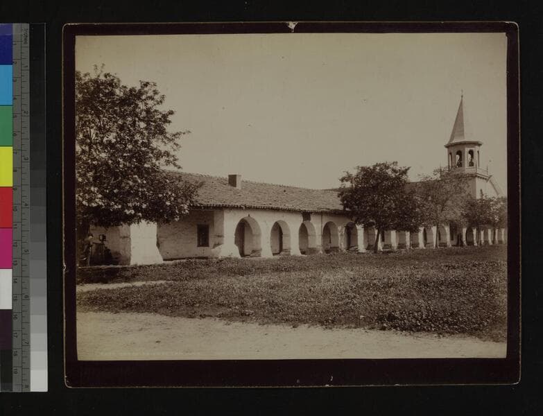 View of campanario, or bell wall, on south side of mission. Two men can be seen beneath the trees blocking view of the mission facade.