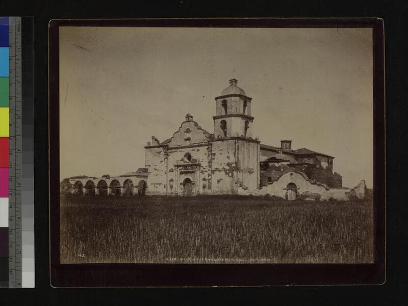 View of campanario, or bell wall, on south side of mission. Two men can be seen beneath the trees blocking view of the mission facade.