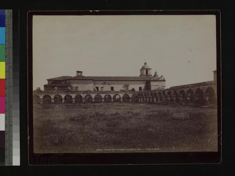 View of mission and cloister ruins. A man with a cart can be seen under the tree at center.
