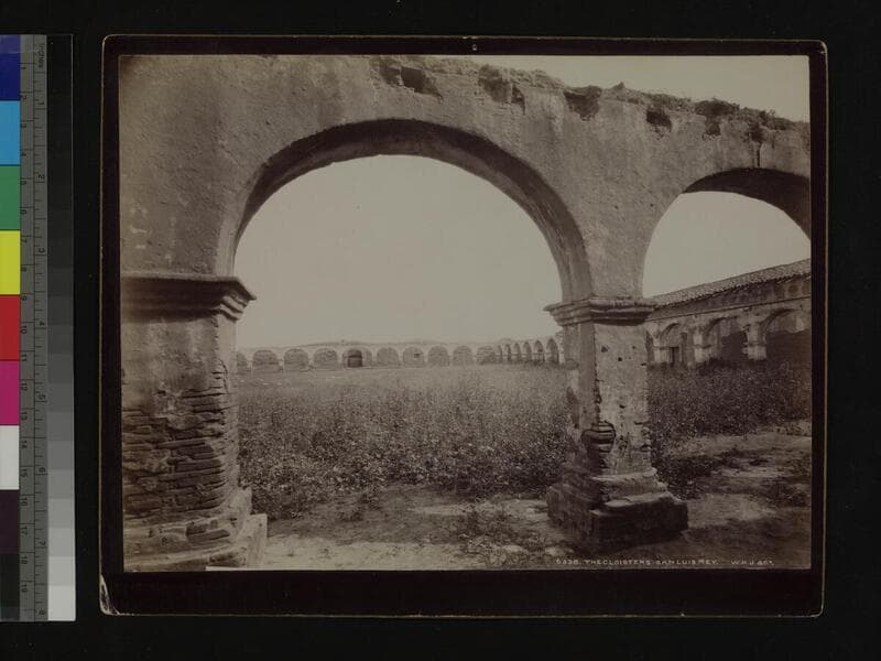 A collection of albumen photographs of 12 California Missions, taken by nineteenth-century photographer William Henry Jackson sometime between 1885 and 1890. All of the photographs are titled and signed, "W.H.J. & Co." One or more images of the following missions are included: San Antonio de Padua, San Carlos Borroméo de Carmel, San Diego de Alcalá, San Fernando Rey, San Francisco de Asís, San Gabriel Arcángel, San Juan Bautista, San Juan Capistrano, San Luis Rey, San Miguel Arcángel, Santa Barbara and Santa Ines. The photographs primarily show the missions' front façades or courtyards, both in ruins and with slight repair work.