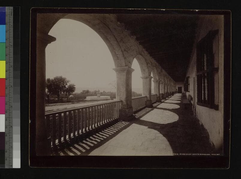 View of fields and distant houses. A fountain and two horses pulling a carriage in the foreground.