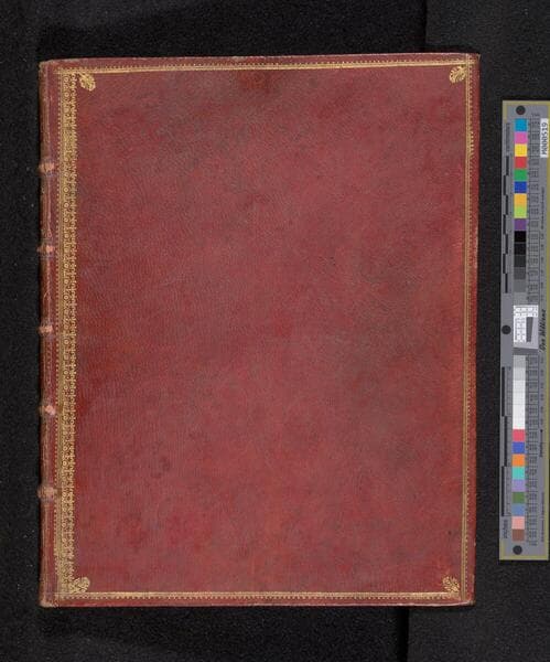 Spaces left on leaves [a]1r and [i]1r for incipits to be added by hand; initial spaces. Signatures: [a-f¹⁰ g⁸ h¹² i-n¹⁰ o-p⁸ *⁴]. Illuminated decorations on leaf [a]1r with blue and maroon flowers with gilt scrolling in Ferrara style, blue capital "S" in gilt panel with red and green fill. Coat of arms [obliterated] in gilt circle in bottom margin. On leaf [i]1r blue and maroon flowers on inner margin with red capital 'M' in gilt panel. Other initials and rubrication in red or blue. Incipits on leaves [a]1r and [i]14 written in red. Binding: mid-18th century Spanish[?] gilt-tooled blue morocco[?].