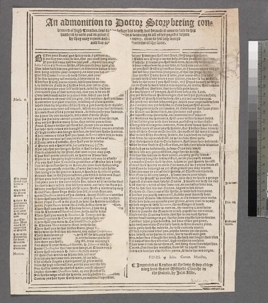 ESTC S121732 ; Signed: q[uod] Iohn. Cornet. minister ; Verse - "Bestur your stomp[es] good Story now, ye gallous [..]" ;J ohn Story was executed in 1571 ; Only known copy mutilated.