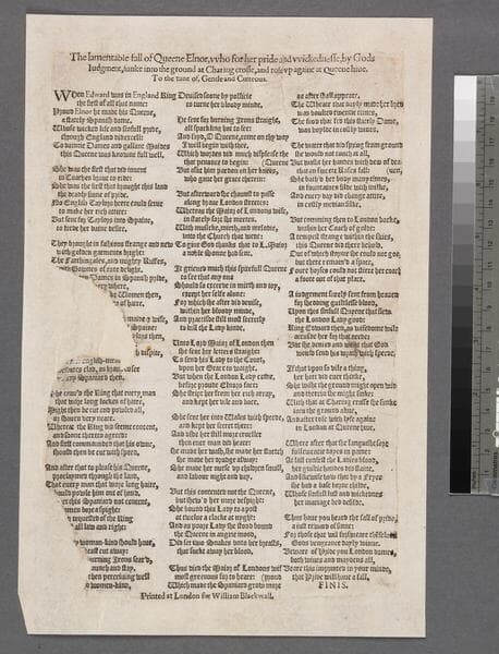 The lamentable fall of Queene Elnor, : vvho for her pride and vvickednesse, by Gods iudgment, sunke into the ground at Charing crosse, and rose vp againe at Queene hiue. To the tune of, Gentle and curteous