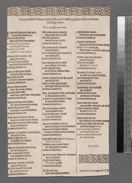 A mournefull dittie, entituled Elizabeths losse, together with a welcome for King Iames. To a pleasant new tune