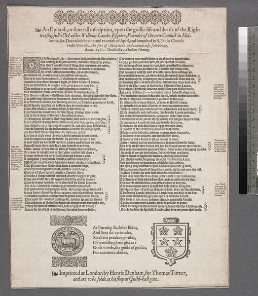 An epitaph, or funerall inscription, vpon the godlie life and death of the right worshipfull Maister William Lambe Esquire, founder of the new conduit in Holborne, &c. Deceased the one and twentith of April, and intumbed in S. Faiths Church vnder Povvles, the sixt of Maie next and immediatly follovving. Anno. 1580. Deuised by Abraham Fleming