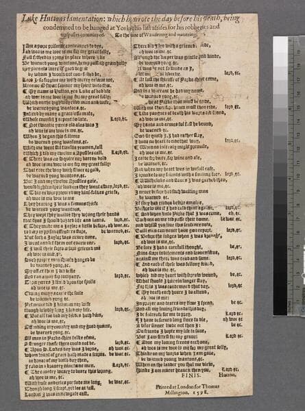 ESTC S121792 ; Signed: Hutton ; Verse - "I am a poore prisoner condemned to dye," ; Only known copy mutilated, affecting title