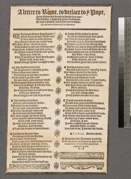 A letter to Rome, to declare to ye Pope, Iohn Felton his freend is hangd in a rope: and farther, a right his grace to enforme, he dyed a papist, and seemd not to turne. To the tune of Row well ye mariners