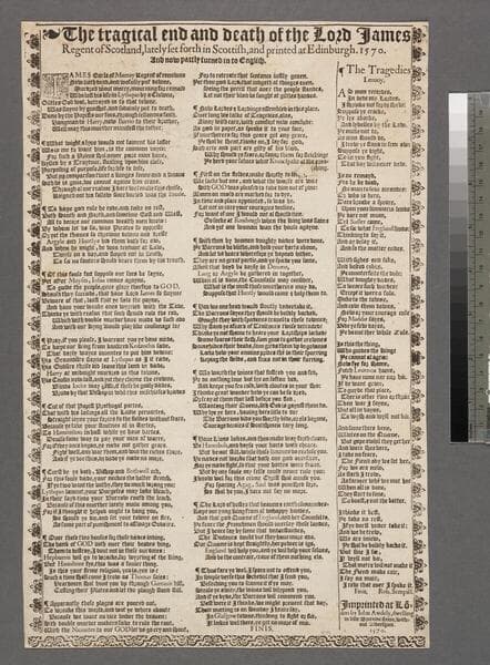 ESTC S121849 ; Signed: Rob. Sempill ; Verse - "Iames Earle of Murray Regent of renowne" ; Originally published the same year in Edinburgh as: The regentis tragedie ; "The tragedies lenuoy" is in a single column at right