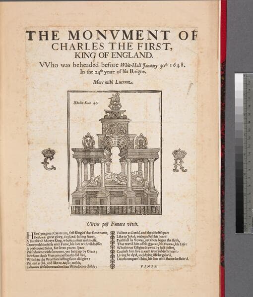 The monument of Charles the First, King of England. : VVho was beheaded before Whit-Hall [sic] January 30th 1648. In the 24th yeare of his reigne